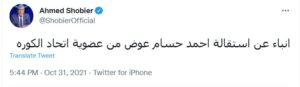 ونشر أحمد شوبير عبر حسابه على تويتر: أنباء عن استقالة أحمد حسام عوض من عضوية اتحاد الكوره.