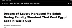 النسخة الإنجليزية من شبكة «يوروسبورت» العالمية، كتبت عما حدث، ووضعت صورة لمحمد صلاح وهو مغطى بالكامل بأشعة الليزر، لتضع في تقريرها تغريدة للكاتب البريطاني، هنري بوشنيل، التي قال فيها: «فقط أنظر لهذا، صلاح أطاح بتسديدته في ركلات الجزاء بعيداً، وبالطبع أي شخص أخر كان سيفعل ذلك نظراً لأشعة الليزر».