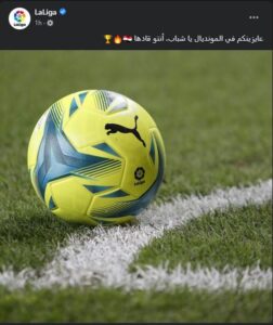 وكتب الحساب الرسمي للـ ” اللاليجا” الإسبانية علي الصفحة الرسمية علي موقع التواصل الإجتماعي رسالة تحفيزية لمنتخب مصر معنوناً “عايزينكم في المونديال يا شباب، أنتو قادها ”