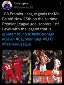 ونشر بيتر كراوتش المهاجم الإنجليزي السابق عبر حسابه الرسمي على تويتر: أحسنت يا مو، لقد احتجت لـ 1104 مباراة لتسجيل هذا العدد من الأهداف، لقد فعلها مو بشكل أسرع، إنه مدهش.