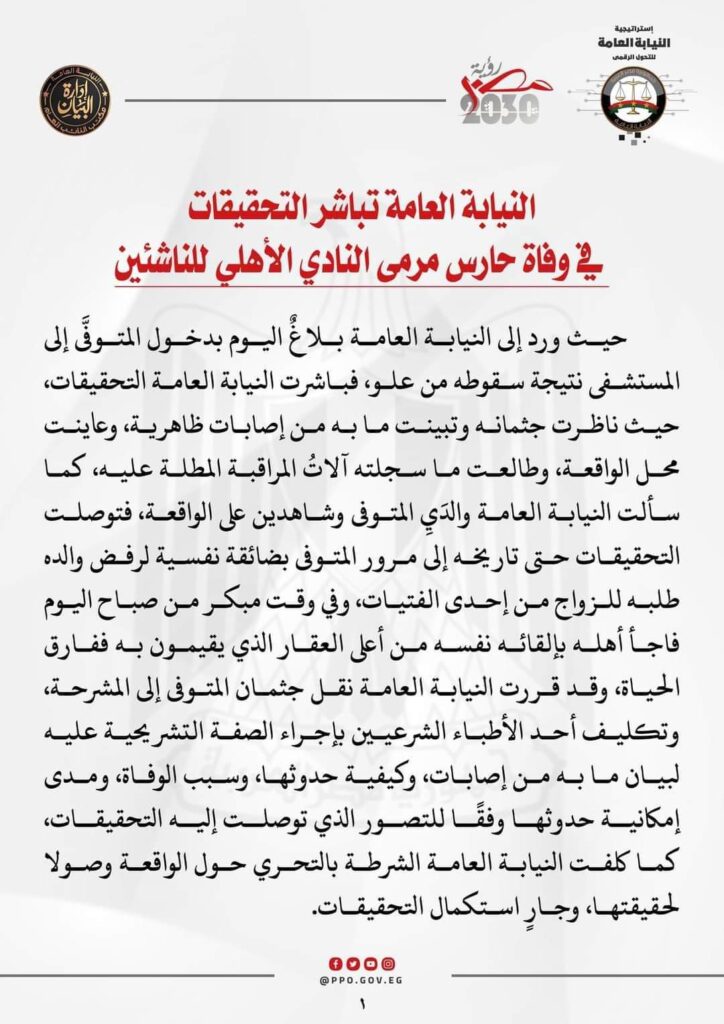 النيابة العامة تعلن تفاصيل وفاة زياد إيهاب حارس الاهلى