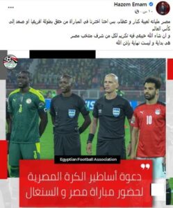 رد حازم امام عضو مجلس ادارة الإتحاد المصرى لكرة القدم على بعض الإنتقادات التى تم توجيهها للإتحاد المصرى بعد دعوة عدد 48 من نجوم الكرة السابقين حيث تم دعوة هولاء لحضور مباراة مصر والسنغال غداً الجمعه فى ذهاب تصفيات كأس العالم القادمة قطر 2022.