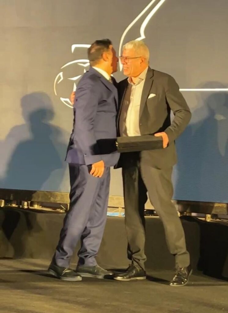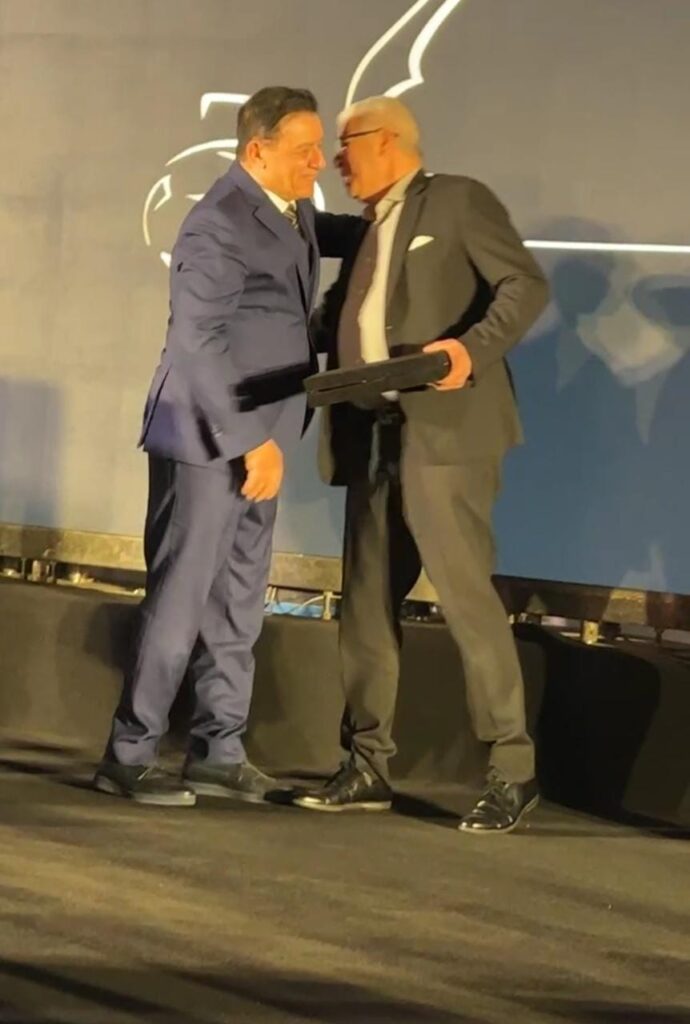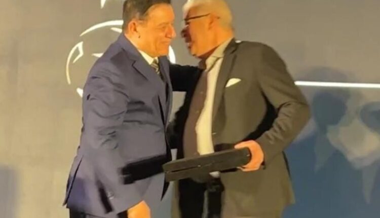 بعد أن أقتسم الأعلاميان احمد شوبير ومدحت شلبي جائزة افضل اعلامي ..تعانق الإثنان وتبادلا القبلات والتهاني