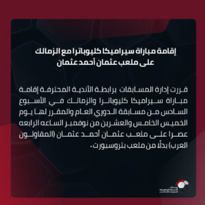 قررت ادارة المسابقات برابطة الأندية المحترفة تغيير ملعب مباراة سيرامكا كليوباترا والزمالك ضمن مواجهات الاسبوع السادس للدوري المصري العام لكرة القدم حيث تم نقل المواجهة من ستاد بتروسبورت الي استاد عثمان احمد عثمان ( المقاولون العرب ) بالجبل الاخضر وتقام المباراة يوم الخميس القادم في تمام الرابعة عصراً .