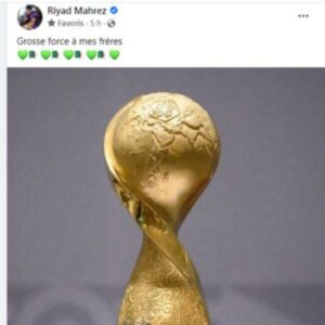 قام رياض محرز نجم مانشستر سيتي الإنجليزي، بدعم تشكيلة المنتخب الجزائري للمحليين، قبل مواجهة تونس ، في نهائي بطولة كأس العرب، حيث كتب محرز، في تغريدة عبر حسابه الشخصي على “فيسبوك”: “أتمنى قوة كبيرة لإخواني اللاعبين”.