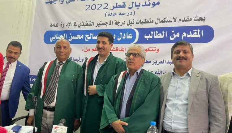 حصل الزميل  الاعلامي اليمني عادل يحيى الحبابي على  درجة الماجستير في الادارة العامة بتقدير امتياز من مركز الادارة العامة بجامعة صنعاء عن رسالته  بعنوان