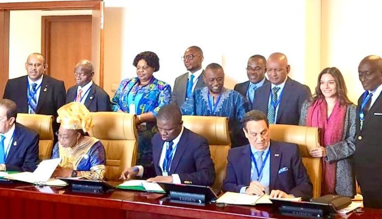 وقع اللواء احمد ناصر رئيس اتحاد الاتحادات الرياضية الافريقية ”  الاوكسا ” .. ومصطفى بيراف  رئيس اتحاد اللجان الاولمبية الافريقية ”  الانوكا ”  وميناتا المفوضة للشؤون الاجتماعية بالاتحاد الافريقي السياسي ووزير الرياضة بغانا على تنظيم دورة الالعاب الافريقية .