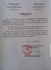 أصدر بول بيا رئيس جمهورية الكاميرون بيان رسمي لتعديل مواعيد العمل والدراسة من أجل التوافق مع المواطنين لحضور ومشاهدة مباريات كأس الأمم الإفريقية.