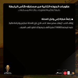 أعلنت رابطة الأندية المصرية عن العقوبات الخاصة بمباريات الجولة الثانية طبقًا لقائمة العقوبات بلائحة المسابقات، من بطولة كأس الرابطة والتي تقام في الوقت الحالي بعد إيقاف الدوري المصري الممتاز، بسبب مشاركة المنتخب الوطني في كأس الأمم الإفريقية.