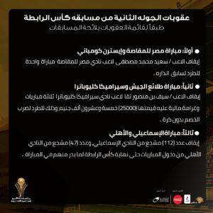أعلنت رابطة الأندية المصرية عن العقوبات الخاصة بمباريات الجولة الثانية طبقًا لقائمة العقوبات بلائحة المسابقات، من بطولة كأس الرابطة والتي تقام في الوقت الحالي بعد إيقاف الدوري المصري الممتاز، بسبب مشاركة المنتخب الوطني في كأس الأمم الإفريقية.