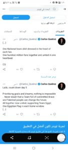 وجميعنا الآن نتحد، لدعم ومساندة منتخب مصر، علم مصري واحد في كل نافذة منزل، قميص منتخب مصر في قلب كل مشجع” ، وتابع “100 مليون مشجع معًا دائمًا ومتحدون على قلب رجل واحد”.
