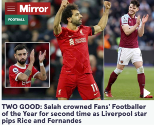 و أضافت الصحيفة الإنجليزية أن الجائزة شارك فيها 140 ألف مشجع في التصويت، و النسبة الأكبر إختارت صلاح للحصول على الجائزة، ويعتبر هذا العام الثاني على التوالي، الذي يحصد فيه محمد صلاح الجائزة.
