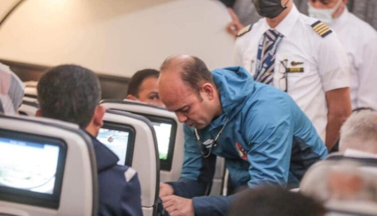 تدخل احمد ابو عبلة، طبيب النادي الاهلي، لاسعاف سيدة على متن الطائرة التي تستقلها بعثة الفريق متجهة الى المغرب لمواجهة الرجاء.