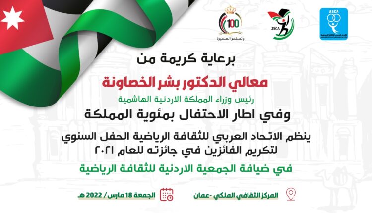 ضمن احتفالات المملكة الاردنية الهاشمية بالعيد المئوي لتأسيسها والعيد 60 لميلاد الملك عبدالله الثاني بن الحسين تشهد قاعة المؤتمرات الكبرى في المركز الثقافي الملكي بعمان السادسة مساء غد الجمعة الحفل الكبير الذي يرعاه دولة رئيس الوزراء الدكتور بشر الخصاونة وتنظمه الجمعية الاردنية للثقافة الرياضية وبإشراف الإتحاد العربي للثقافة الرياضية حيث سيتم خلال الحفل تكريم الفائزين بجوائز الاتحاد العربي عن العام 2021 .