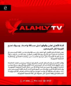وجاء نص البيان كالاتى ” تعلن قناة النادى الاهلى انها تقف على مسافة واحدة من كافة المرشحين فى انتخابات النادى التى ستجرى يوم 26 نوفمبر المقبل، وابتداءً من اليوم سوف تمنح القناة الفرصة لكل مرح للحديث عن برنامجه الانتخابى ومخاطبة الجمعية العومية ”