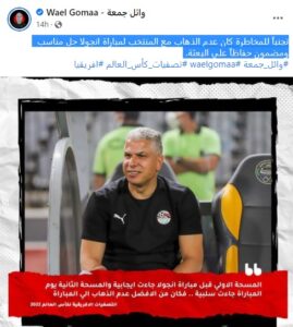 وكتب جمعة علي صفحته الشخصية : تجنباً للمخاطرة كان عدم الذهاب مع المنتخب لمباراة انجولا حل مناسب ومضمون حفاظاً علي البعثة .