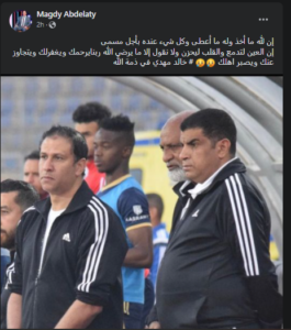 ونشر مجدي عبد العاطي المدير الفني الحالي لفريق فاركو عبر حسابه الرسمي علي موقع التواصل الإجتماعي “فيسبوك” ناعياً الفقيد ” إن لله ما أخذ وله ما أعطى وكل شيء عنده بأجل مسمى